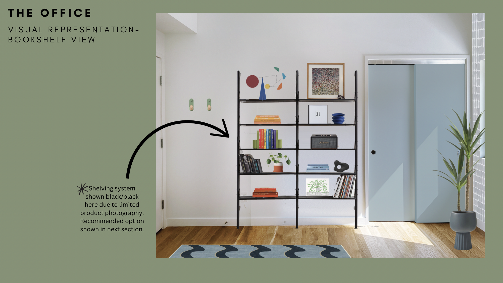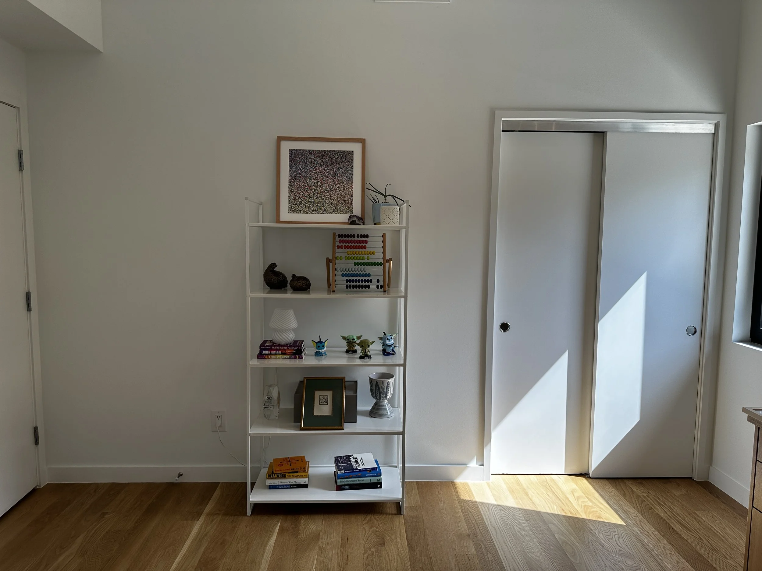 The stark white walls, overall bright lightness and high, angled ceiling were absolutely giving art gallery, which we loved. So when it came to the design we used that as a jumping off point—adding three long, floating wood shelves that would tie into the desk, provide plenty of space for displaying said art, and draw the eye up to better appreciate the height of that wall. We also added a muted blue dashed wallpaper to further showcase the ceiling height.