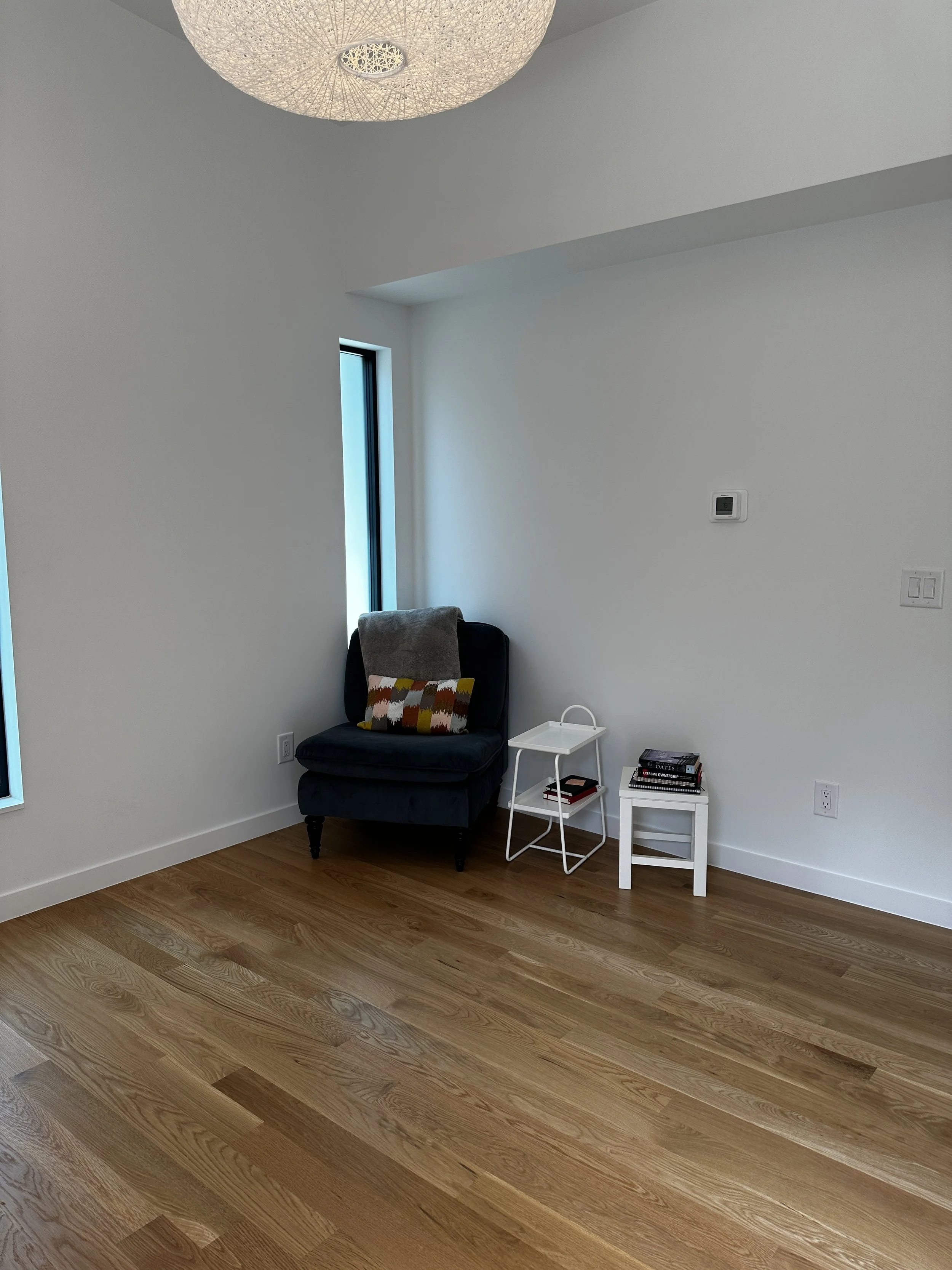 Our client was looking for a space where she could not only work, but also have a personal retreat for relaxing and reading. While it was a beautiful blank slate, overflowing with natural light and an expansive built-in desk, the room needed some added warmth, softness and color.