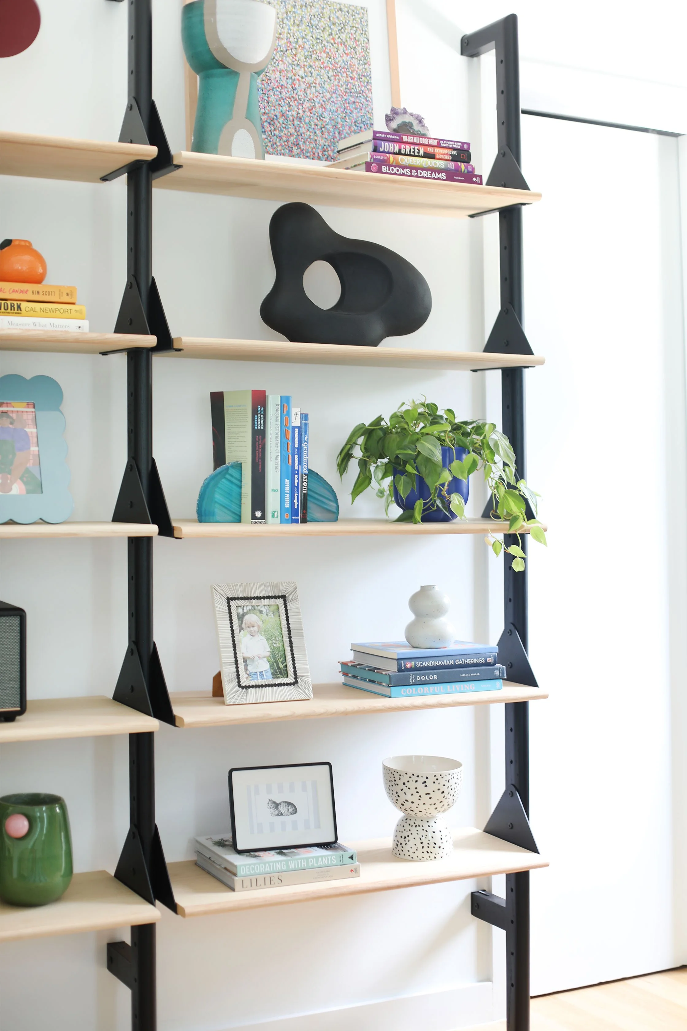 Ceramic geometric wall art and vases sprinkled throughout the room add dimension and texture. A collection of illustrations, paintings and art prints with limited color palettes creates a look that feels collected without coming off as cluttered.