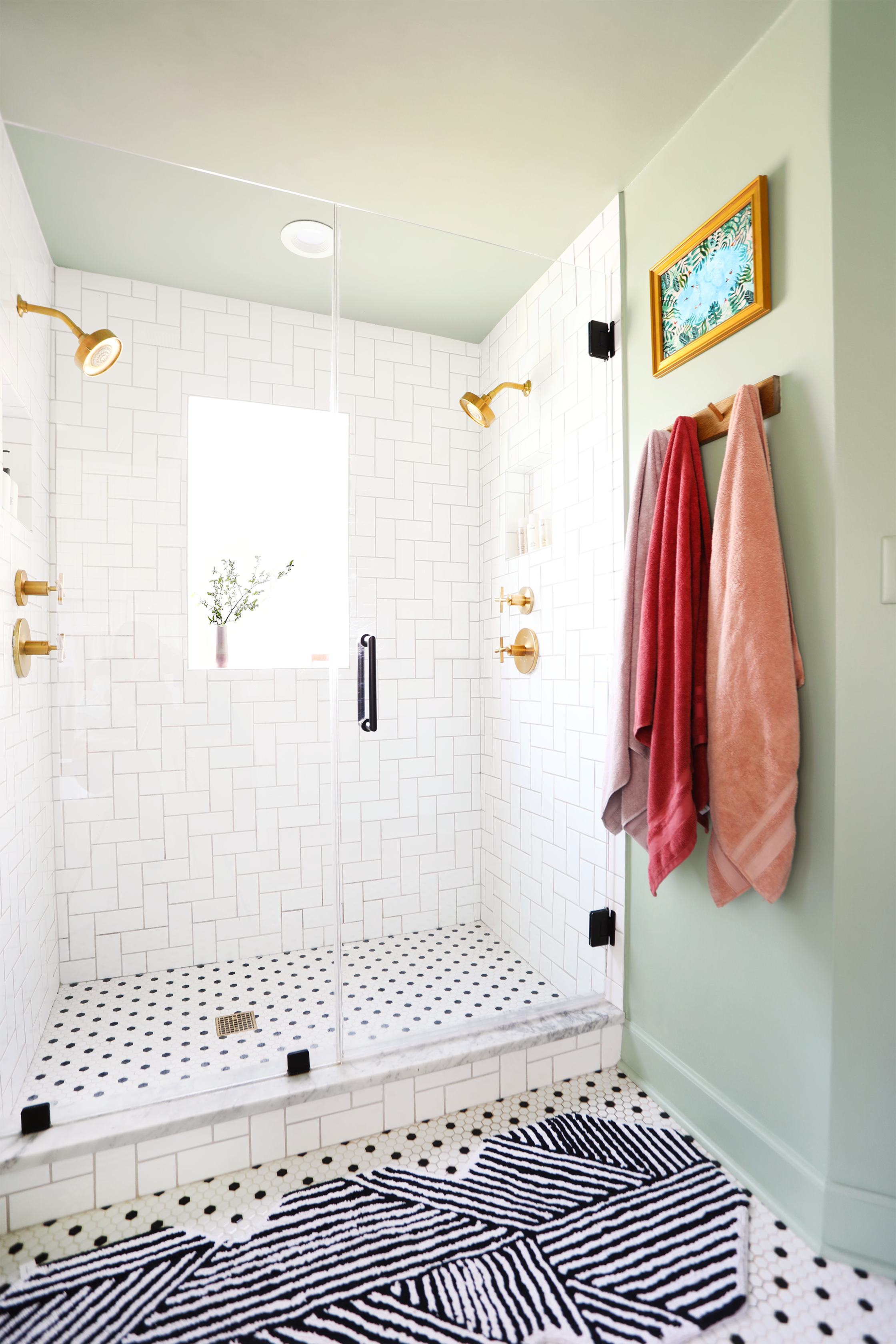 A fun zig zag rug with an interesting shape in front of the shower and a color block rug in front of the vanity to bring in another pop of color—which I also carried through in the bath towels.
