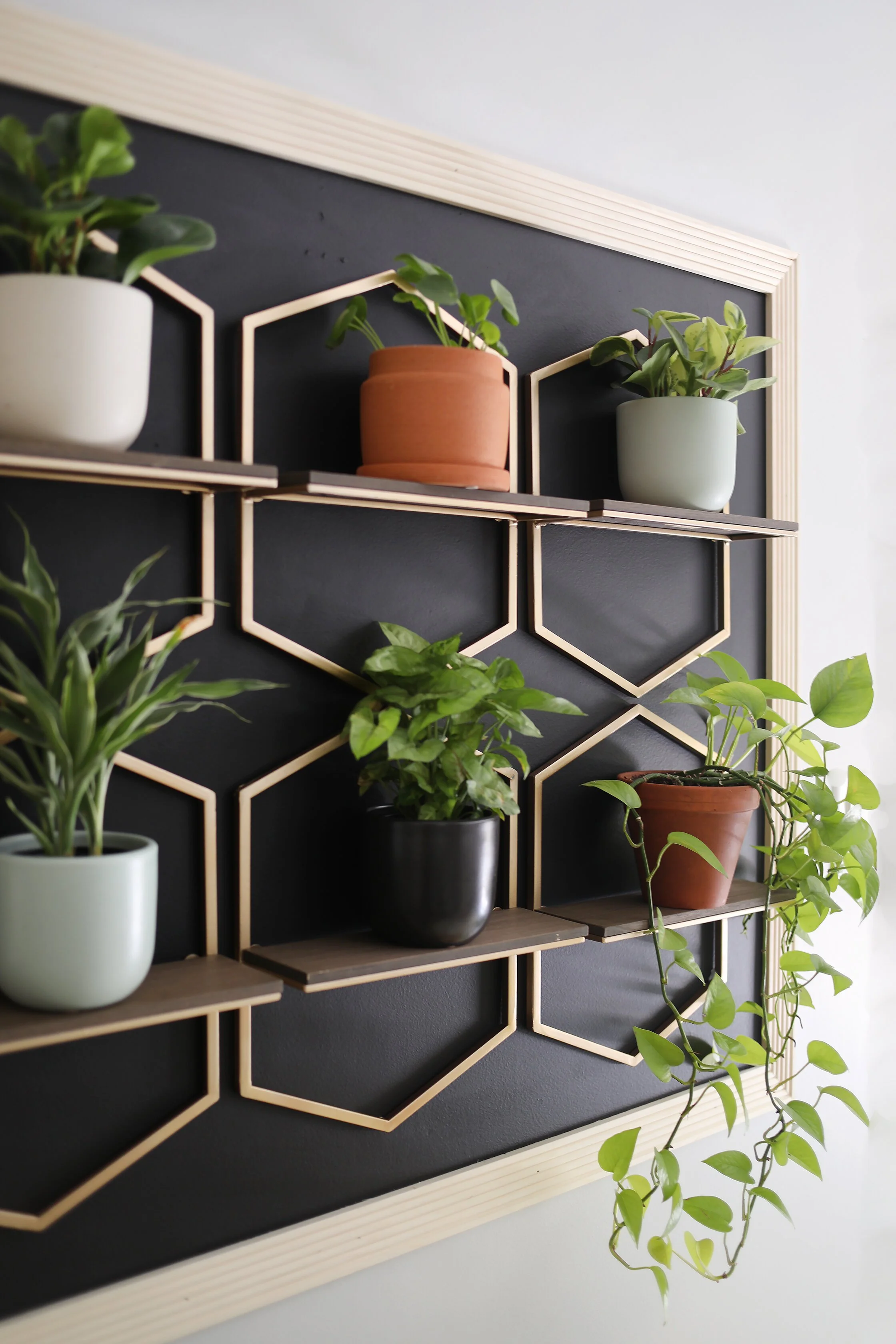 I chose a few sets of those hexagon floating shelves and made a petite plant wall with a mix of chalkboard paint, a few pieces of beaded wood casing and the plants of course!