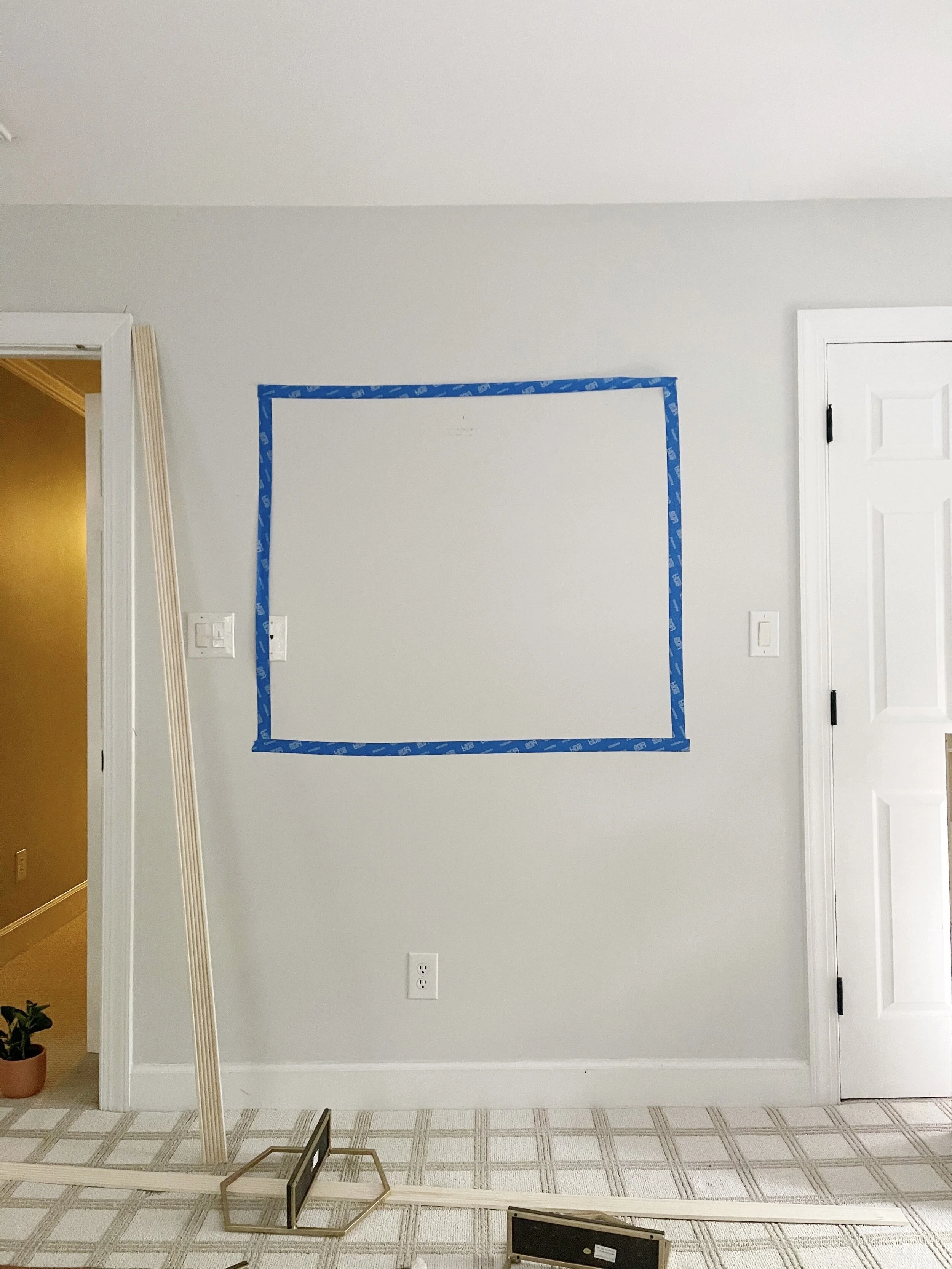 Time to install and put everything together! I purchased a nailer kit when we were working on the millwork in the gym last year so I had one on hand – but if you don’t have one, you could use trim nails and an old fashion hammer to secure the pieces around the painted area. I didn’t end up covering the nail heads bc I didn’t mind seeing them and they are super small. But to cover those up, grab some wood putty and ultra fine sandpaper to smooth and even everything out.